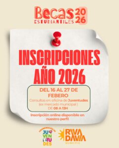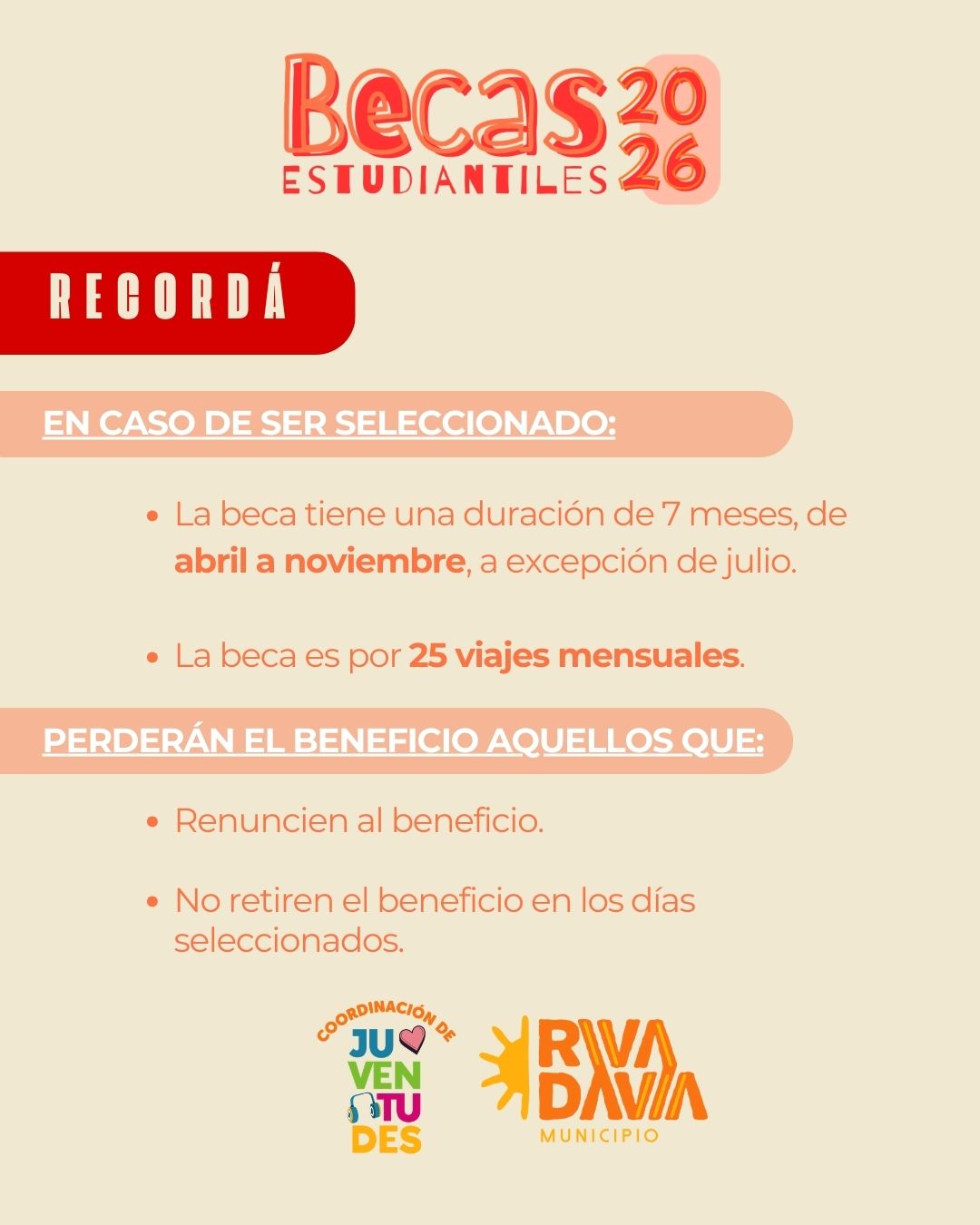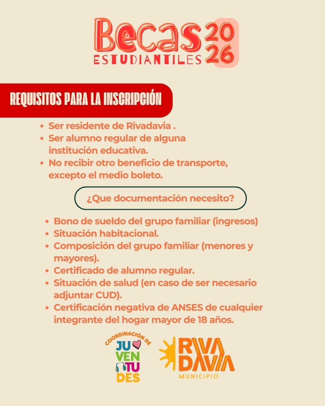 El Municipio de Rivadavia informa que se encuentra abierta la convocatoria al programa Becas Estudiantiles 2026, una iniciativa destinada a acompañar a estudiantes del departamento y facilitar la continuidad de sus trayectorias educativas mediante el apoyo en gastos de transporte.