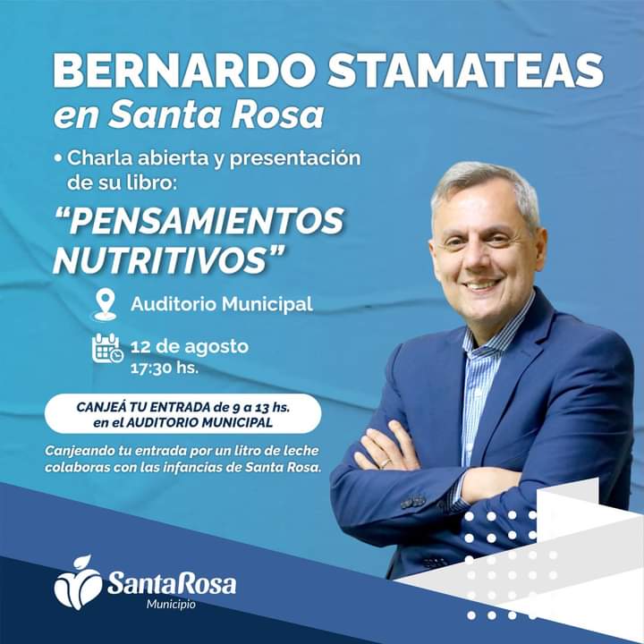 El reconocido autor y conferencista Bernardo Stamateas presentará su más reciente libro, “Pensamientos Nutritivos”, en una charla abierta al público que se llevará a cabo a las 17:30 hs en el Auditorio Municipal.