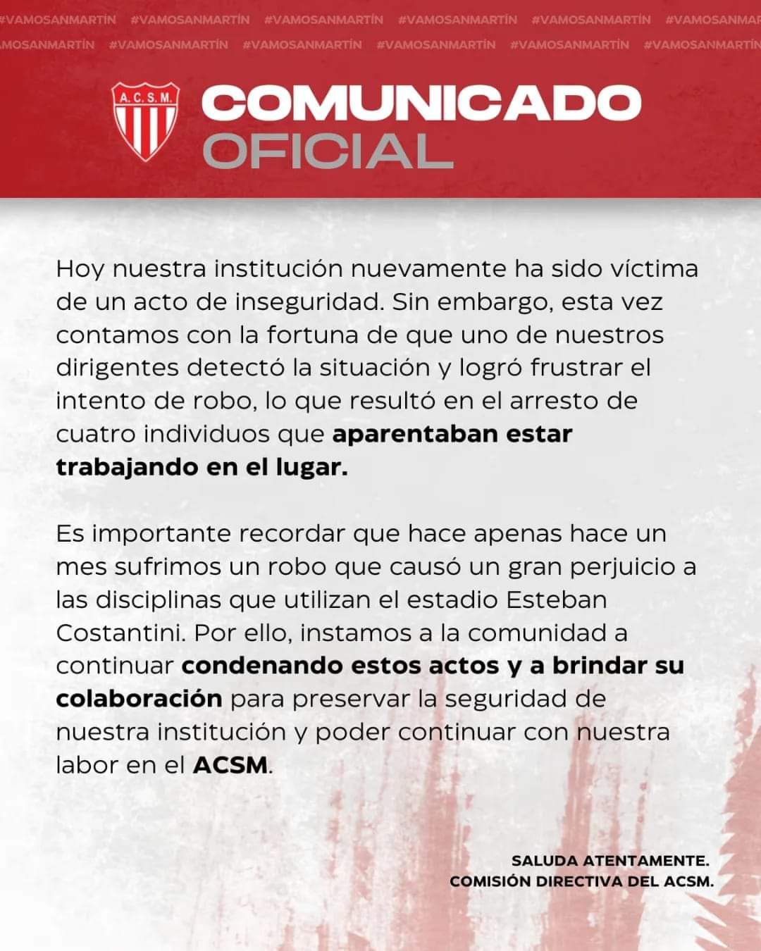 Desde el club esteño emitieron un comunicado en repudio a estos actos de vandalismo de la Infraestructura y materiales de trabajo de jugadores que son logrados con el esfuerzo y aportes de años de todas las familias del Club.