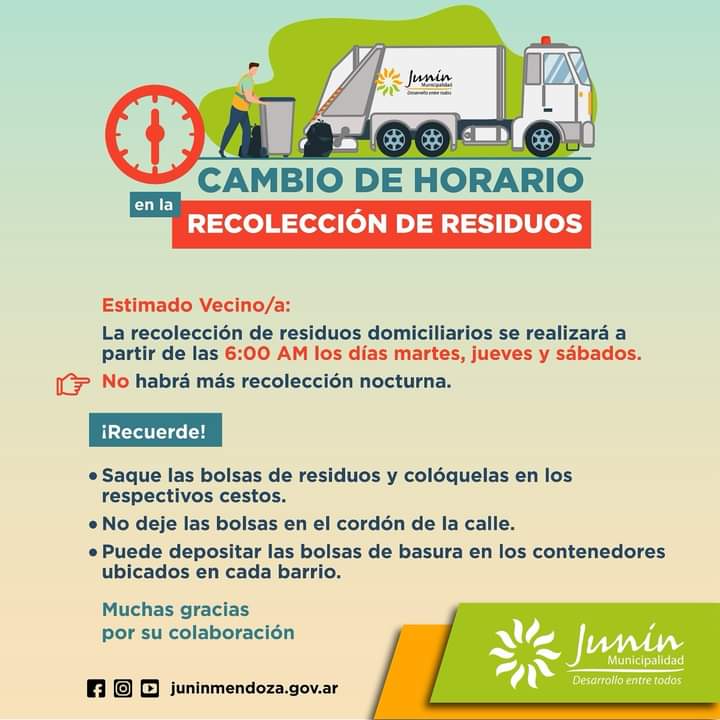 El horario de recolección de residuos se realizará los **martes, jueves y sábados**, comenzando a las **6am**. De esta manera, no habrá más recolección nocturna.