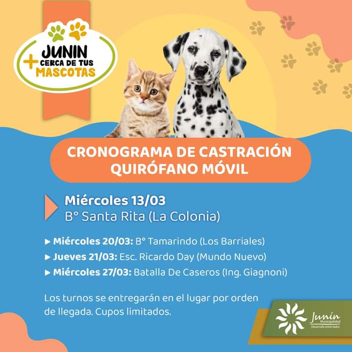 Los turnos se entregarán a partir del lunes 4 de marzo, y durante todos los lunes, desde las 7.30, en la Dirección de Veterinaria del Municipio (calle Salvador González 525, Ciudad de Junín). No es necesario asistir con el animal el día de entrega de los turnos.