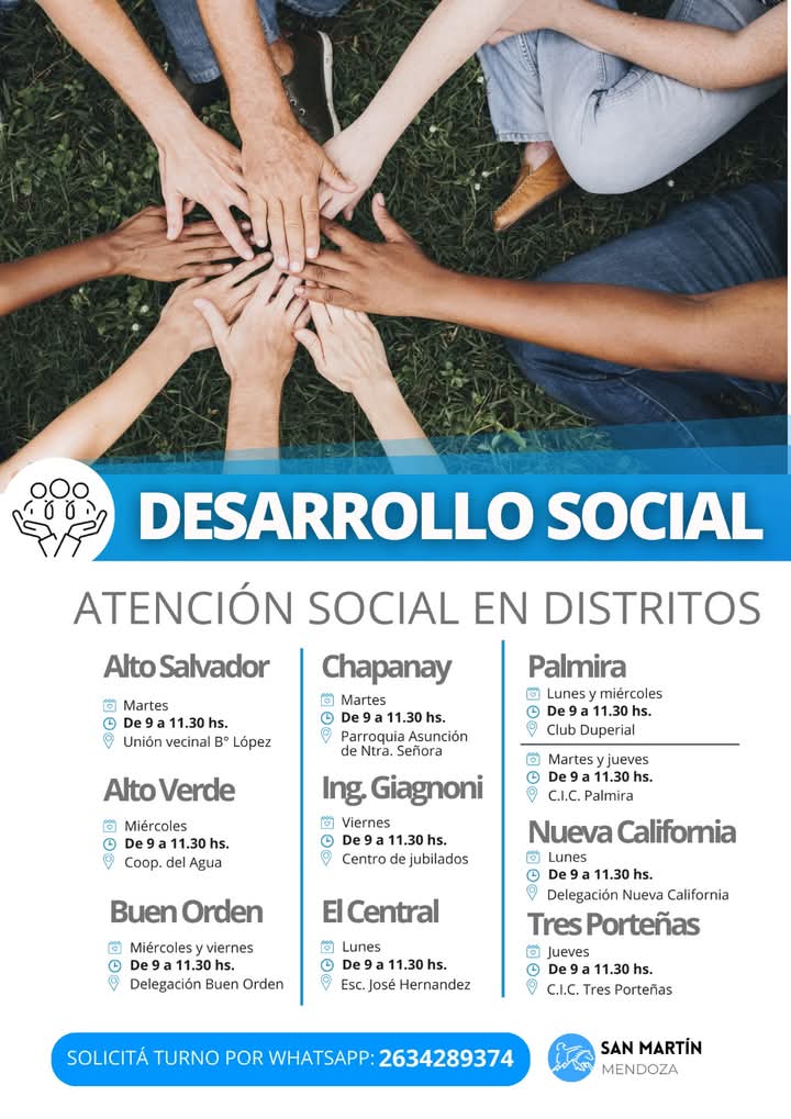 La dirección de Desarrollo Social de la comuna de Gral. San Martín tiene un calendario semanal de atención en los distritos, para el que se puede sacar turno, a través del WhatsApp 2634289374. La atención es, en todos los casos, de 9.30 a 11.30.