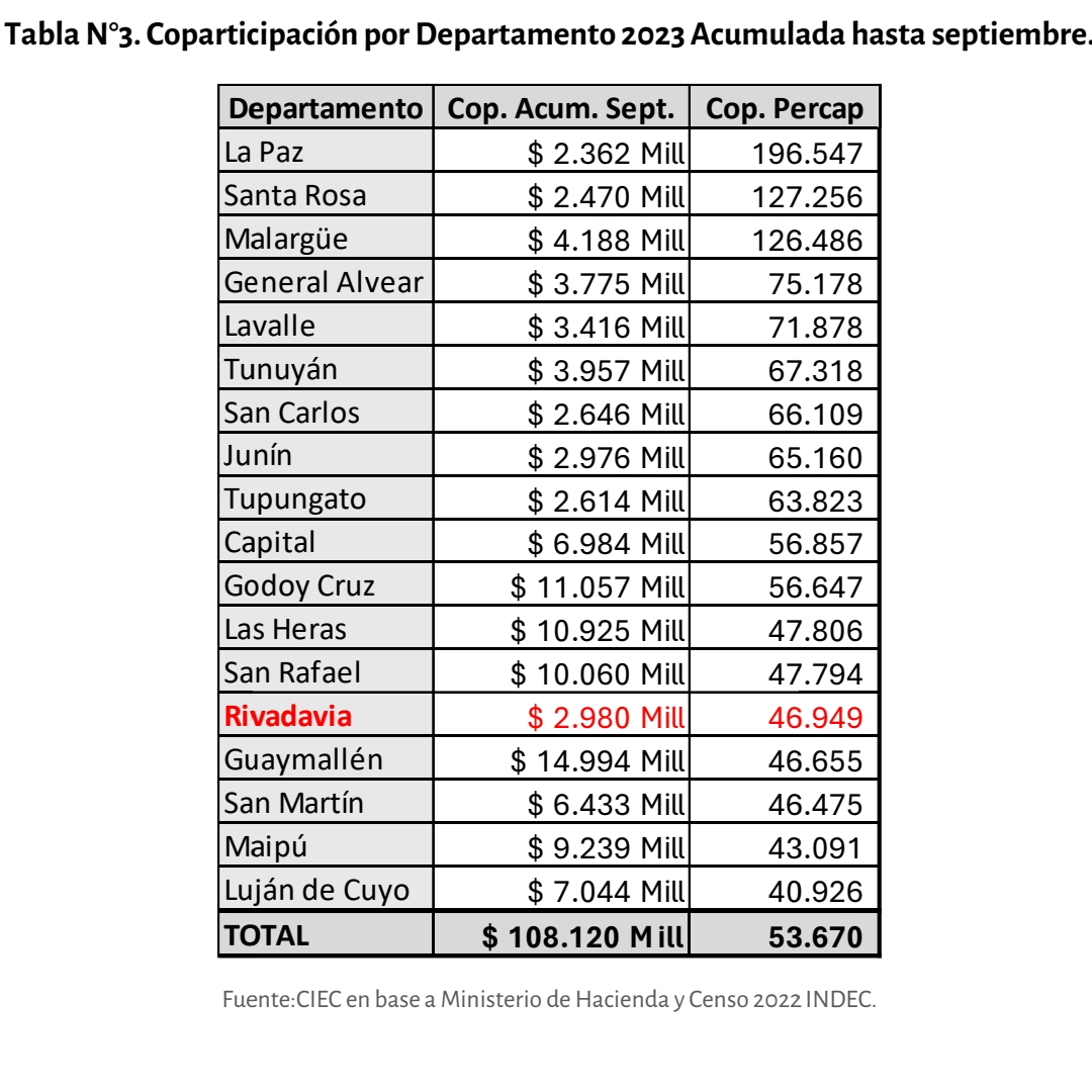 Según un informe del CIEC (Centro de investigaciones de Economía Critica) sobre lo transferido por el Gobierno de Mendoza en el año 2023 en concepto de Coparticipación a todos los Departamentos, Rivadavia se encuentra el puesto 14 de 18 departamentos muy por debajo de Junín, Lavalle, Tunuyán, Santa Rosa y La Paz.