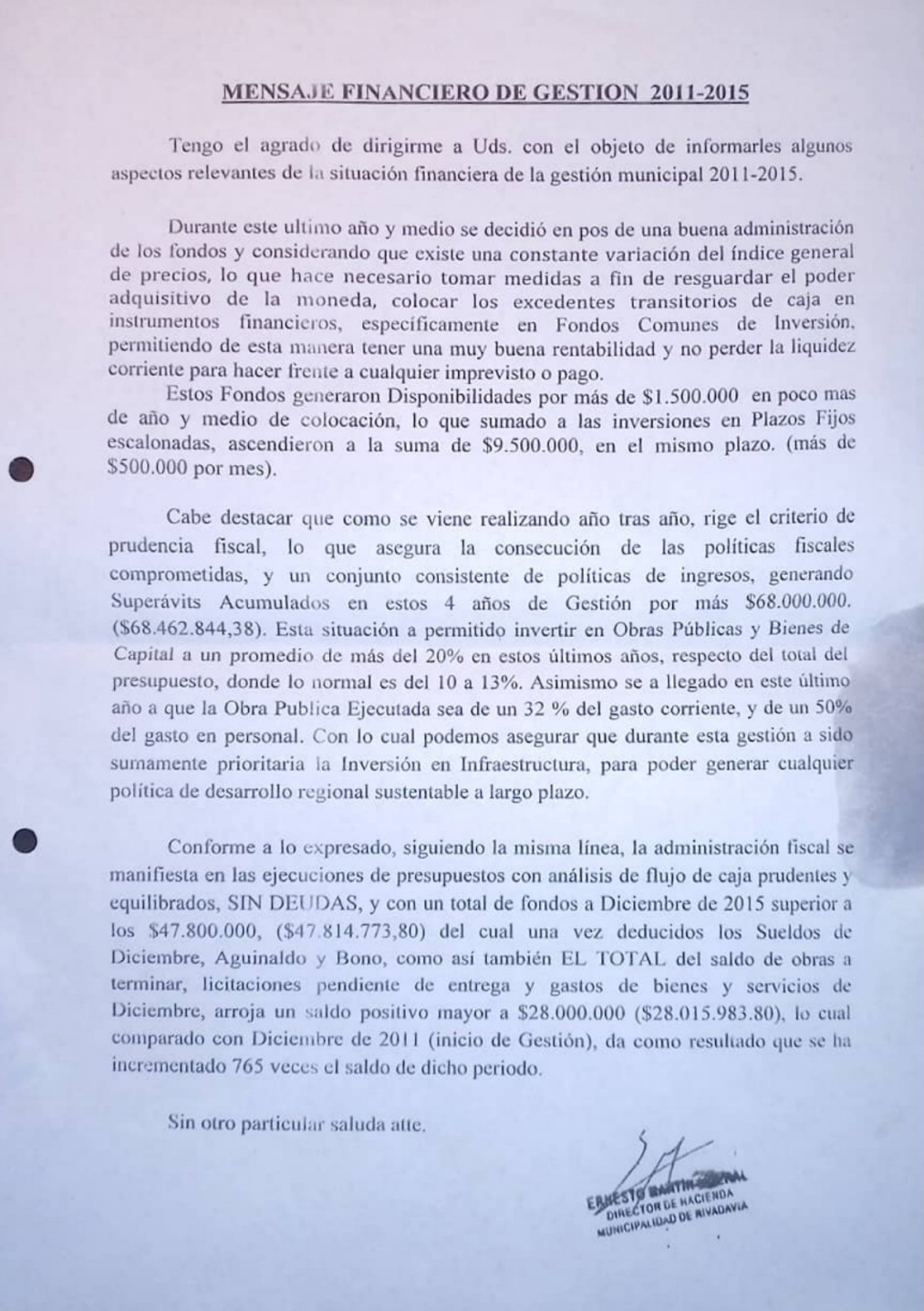 La preocupación de Mansur es una sola: las cuentas. Sabe lo que dejó hace 8 años, incluso se encargó de repartir a los medios durante la campaña una nota firmada por el Secretario de Hacienda en 2015 donde expresaba el estado comunal, el superávit de su gestión y principalmente las reservas que dejo con aguinaldo, bonos, certificados de obra y todos los compromisos de diciembre pagos: ese número asciende los 28 millones de pesos de reserva.