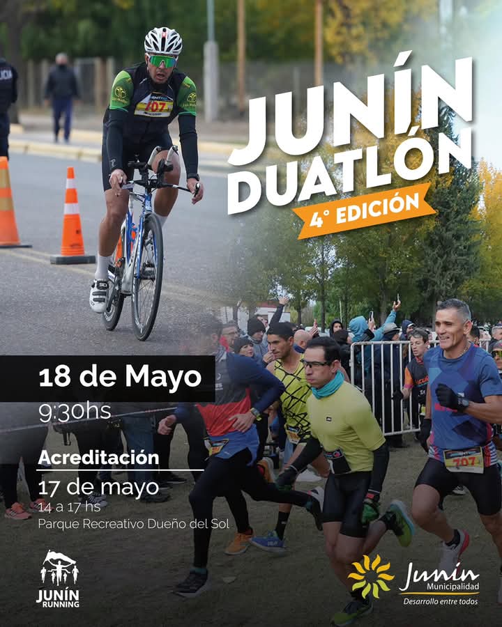 El domingo 18 de mayo, desde las 9:30 hs 🕤, se realizará la 4° edición del Junín Duatlón 🚴🏃, bajo organización de Junín Running y el auspicio de la Municipalidad de Junín 🏛️.