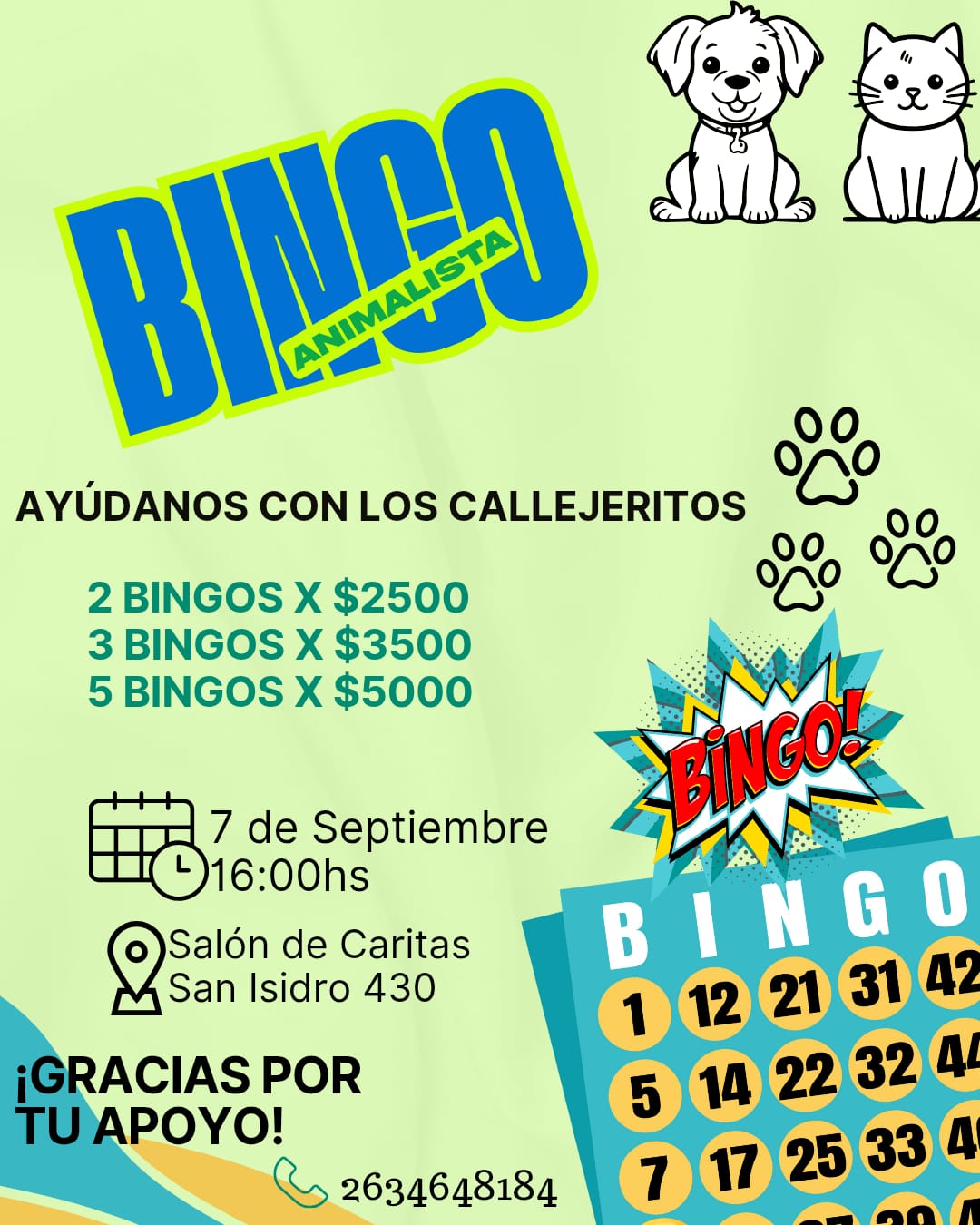 El próximo domingo 7 de septiembre a las 16 horas se realizará el Gran Bingo Animalista en el salón de Cáritas, ubicado detrás de la Iglesia San Isidro Labrador, en Rivadavia. La iniciativa es organizada por el grupo Animalistas de Rivadavia, quienes trabajan de manera voluntaria en el rescate y cuidado de animales en situación de calle.