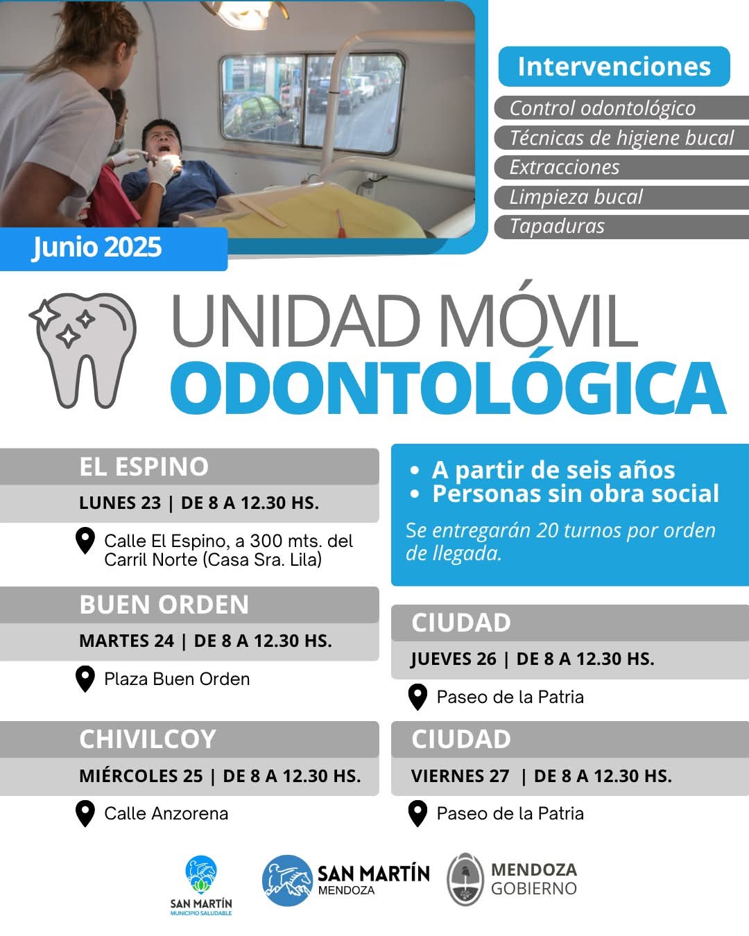 Desde hoy y hasta el viernes 27 atiende en San Martín y de manera gratuita, el móvil odontológico del Gobierno de Mendoza. El horario es de 8 a 12.30; los turnos de 20 cupos se entregan en el lugar, por orden de llegada.