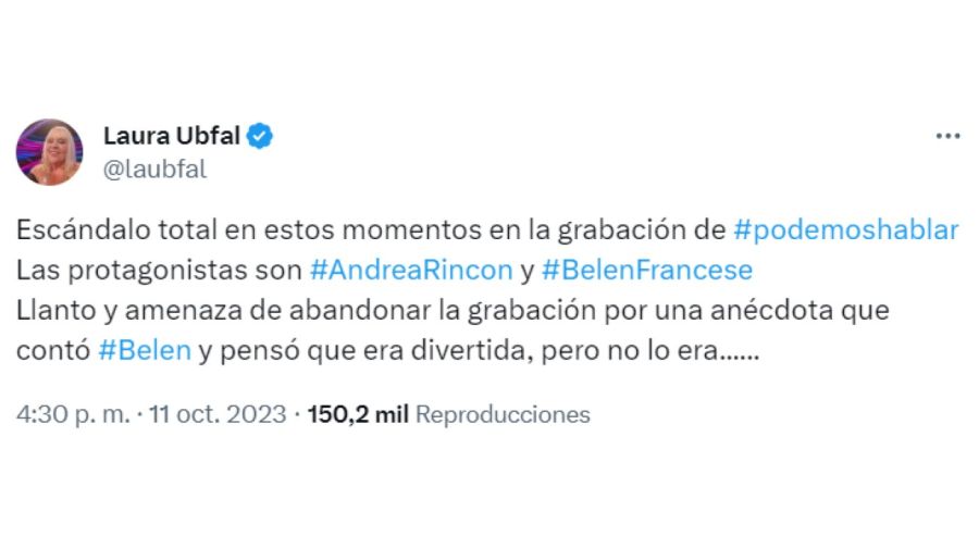 «Escándalo total en estos momentos en la grabación de #podemoshablar. Las protagonistas son #AndreaRincon y #BelenFrancese», anunció. Y detalló el motivo del enojo: «Llanto y amenaza de abandonar la grabación por una anécdota que contó #Belen y pensó que era divertida, pero no lo era…».