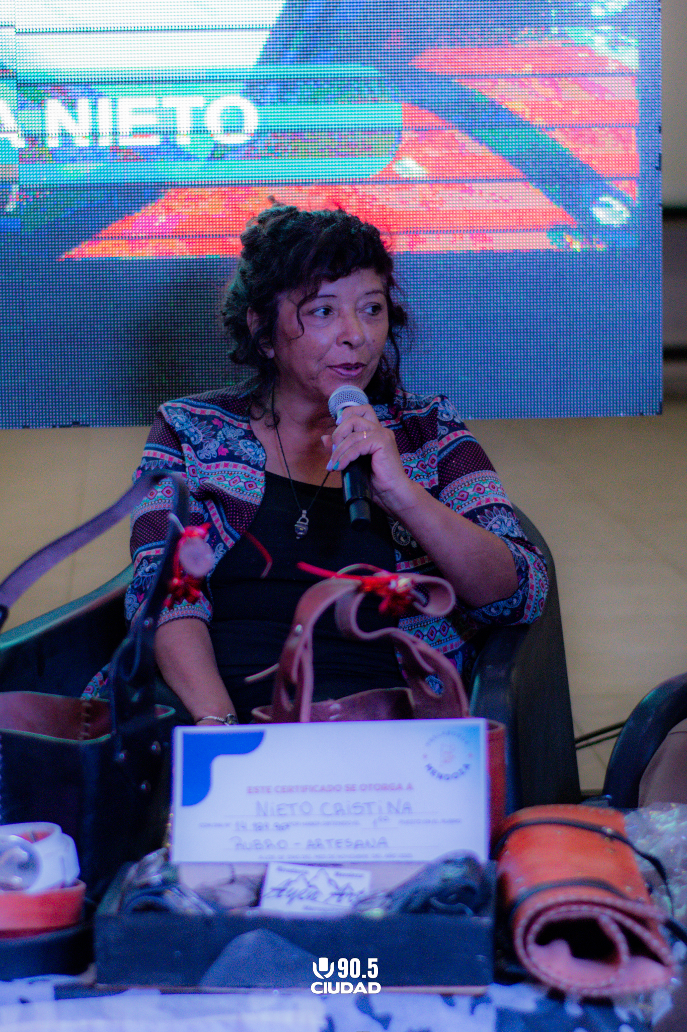 Cristina relató con emoción su trayectoria: “Somos porteños radicados acá en Rivadavia desde hace trece años, y esto es un orgullo enorme. Es la primera vez que Mendoza lleva un artesano al festival de Laborde y me toca representar a mi querida Rivadavia”, explicó. Ella lidera el emprendimiento familiar, que trabaja principalmente el cuero —materos, rastras, porta lapiceros, cinturones, carteras y maletines— y hoy incorpora también símil cuero por la situación de costos. Cristina contó que comenzó a formarse con cursos para obtener el certificado que le permite enseñar: “Ahora doy marroquinería en la Biblioteca Municipal Angélica los viernes”, detalló.