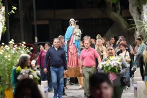 El recorrido de la imagen de la Virgen por las calles de Ciudad fue uno de los momentos más emotivos de la celebración, que culminó frente al edificio parroquial, donde se llevó a cabo la misa central, presidida por el Padre Matías Brain.