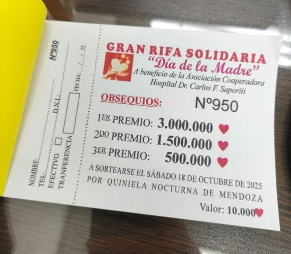 Respecto a la rifa, informó que se realizará el sábado 18 de octubre, día previo al Día de la Madre, y se sorteará a través de la Quiniela de Mendoza nocturna. Los premios son: tres millones de pesos para el primer lugar, un millón quinientos mil para el segundo y mil para el tercero. Cada boleto tiene un valor de $10.000 y puede adquirirse contactando a la cooperadora o en la imprenta Callera.