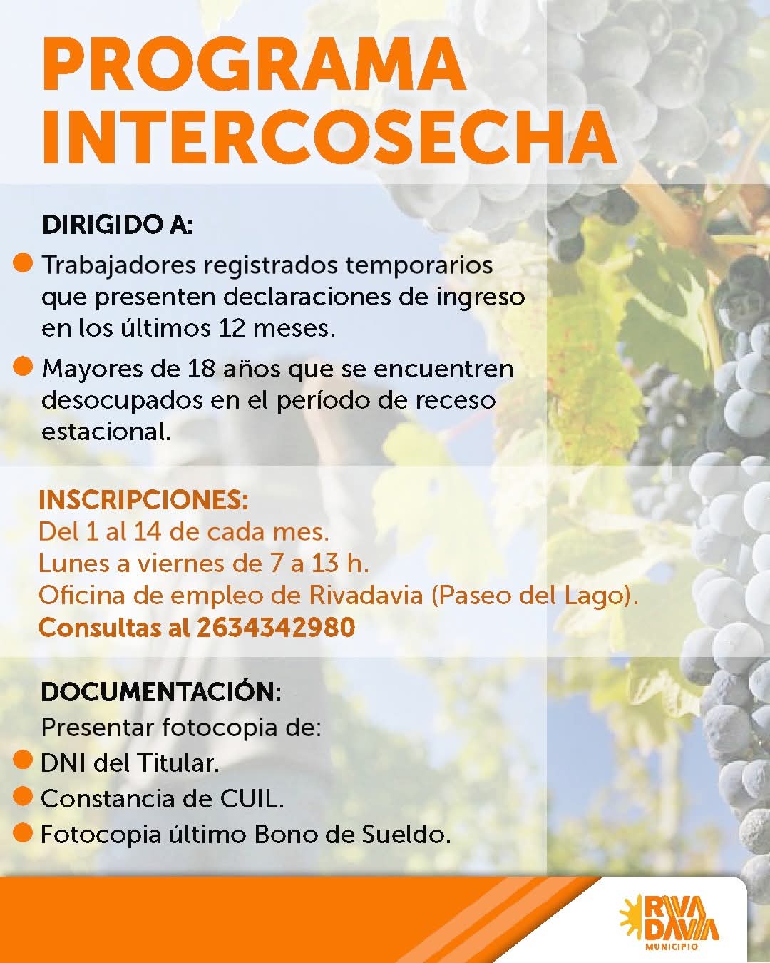 La Municipalidad de Rivadavia informa que están abiertas las inscripciones para el Programa Intercosecha 2025, dirigido a trabajadores registrados temporarios que presenten declaraciones de ingreso en los últimos 12 meses y a personas mayores de 18 años que se encuentren desocupadas durante el receso estacional.
