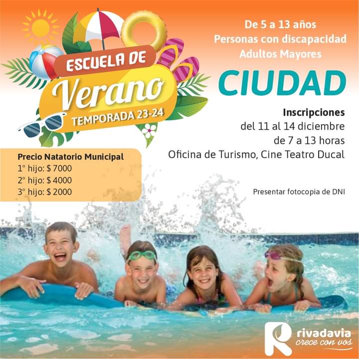 La Municipalidad de Rivadavia informa que se encuentran abiertas las inscripciones en Ciudad y distritos para niños/as de 5 a 13 años, personas con discapacidad y adultos mayores que deseen participar de la Escuela de Verano 2023/2024.