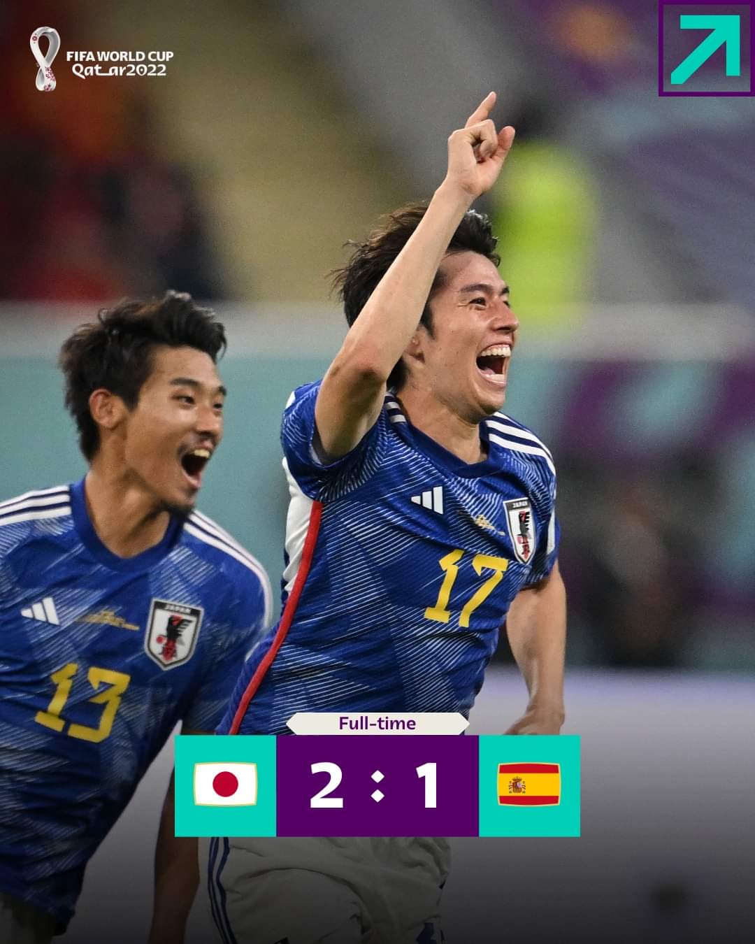 En el complemento, Japón salió con otra actitud y consiguió el empate a los 48 minutos, con el tanto del recién ingresado Ritsu Doan. Unos instantes más tarde, tras una jugada chequeada por el VAR, Ao Tanaka empujó la pelota con la rodilla y puso en ventaja al conjunto nipón. Este resultado le aseguró a Japón y a España el pase a octavos de final.