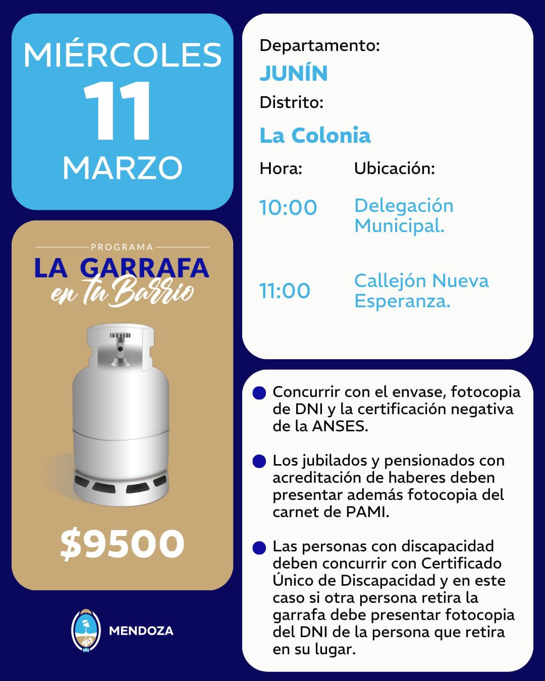 La Municipalidad de Junín informó que el programa provincial La Garrafa en tu Barrio llegará al distrito de La Colonia, con el objetivo de facilitar el acceso al gas envasado a precio subsidiado para los vecinos.