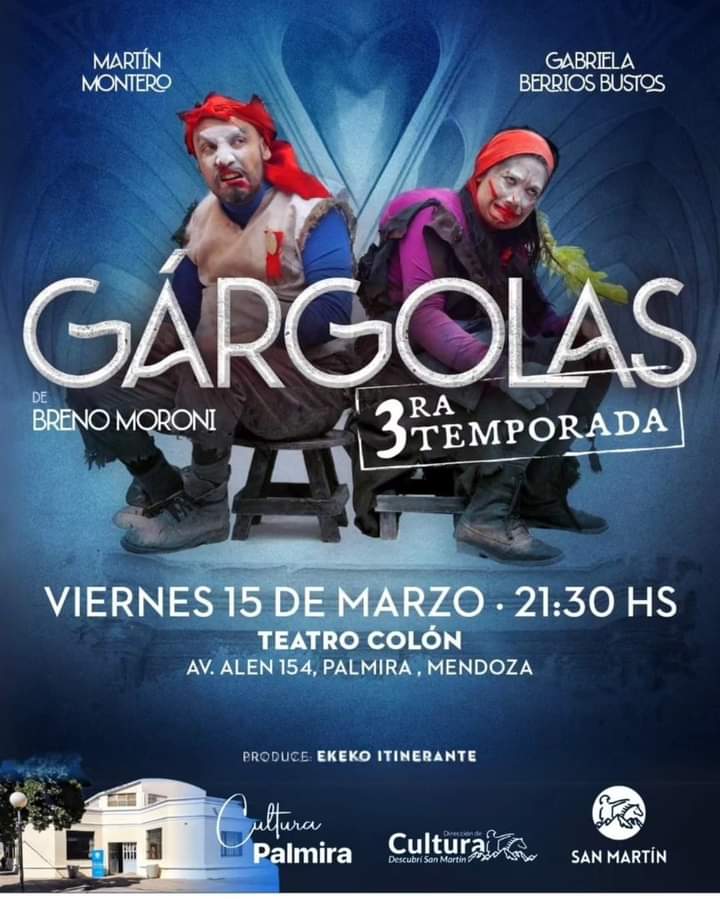 Mañana a las 21.30, en el Cine Teatro Colón, de Palmira, se presenta la obra “Gárgolas”, del autor brasilero Breno Moroni. El evento está auspiciado por la Comuna de General San Martín. La propuesta combina circo, pantomima y grotesco, junto a la sencillez de una esencial manera de comunicar, que permite a niños y adultos disfrutar de un espectáculo que entretiene y emociona. La entrada tiene un valor de 3.000 pesos y hay precios especiales para escuelas.