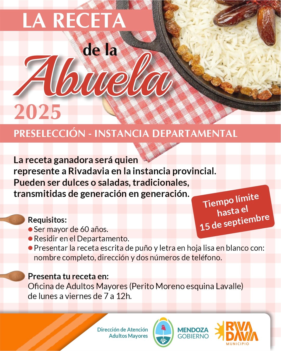 La Municipalidad de Rivadavia abrió la convocatoria para participar de La Receta de la Abuela 2025, un certamen que busca rescatar y poner en valor las tradiciones gastronómicas transmitidas de generación en generación.