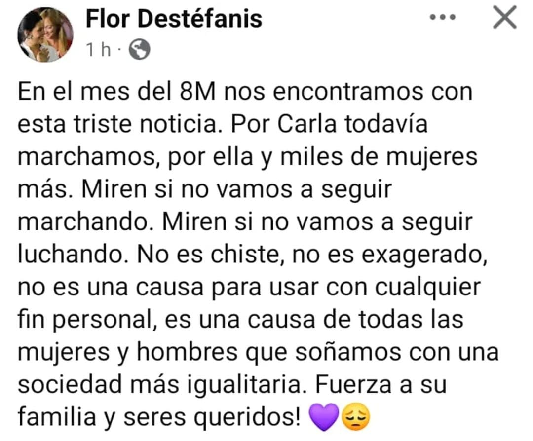 El crimen generó una ola de indignación y dolor en redes sociales. La intendenta de Santa Rosa, Flor Destéfanis, publicó un mensaje en el que expresó: “Por Carla todavía marchamos, por ella y por miles de mujeres más”.