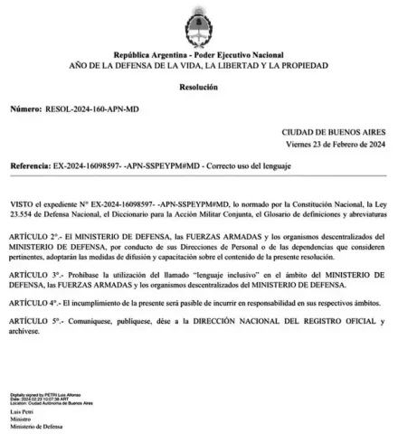 El ministro de Defensa, Luis Petri, prohibió el uso del lenguaje inclusivo dentro de las Fuerzas Armadas y dispuso que quienes incumplan la medida podrán ser sancionados.