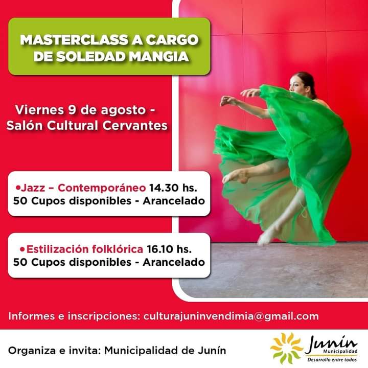 Con el apoyo de la Municipalidad de Junín, el próximo viernes 9 de agosto, se desarrollarán dos imperdibles Masterclass a cargo de Soledad Mangia.