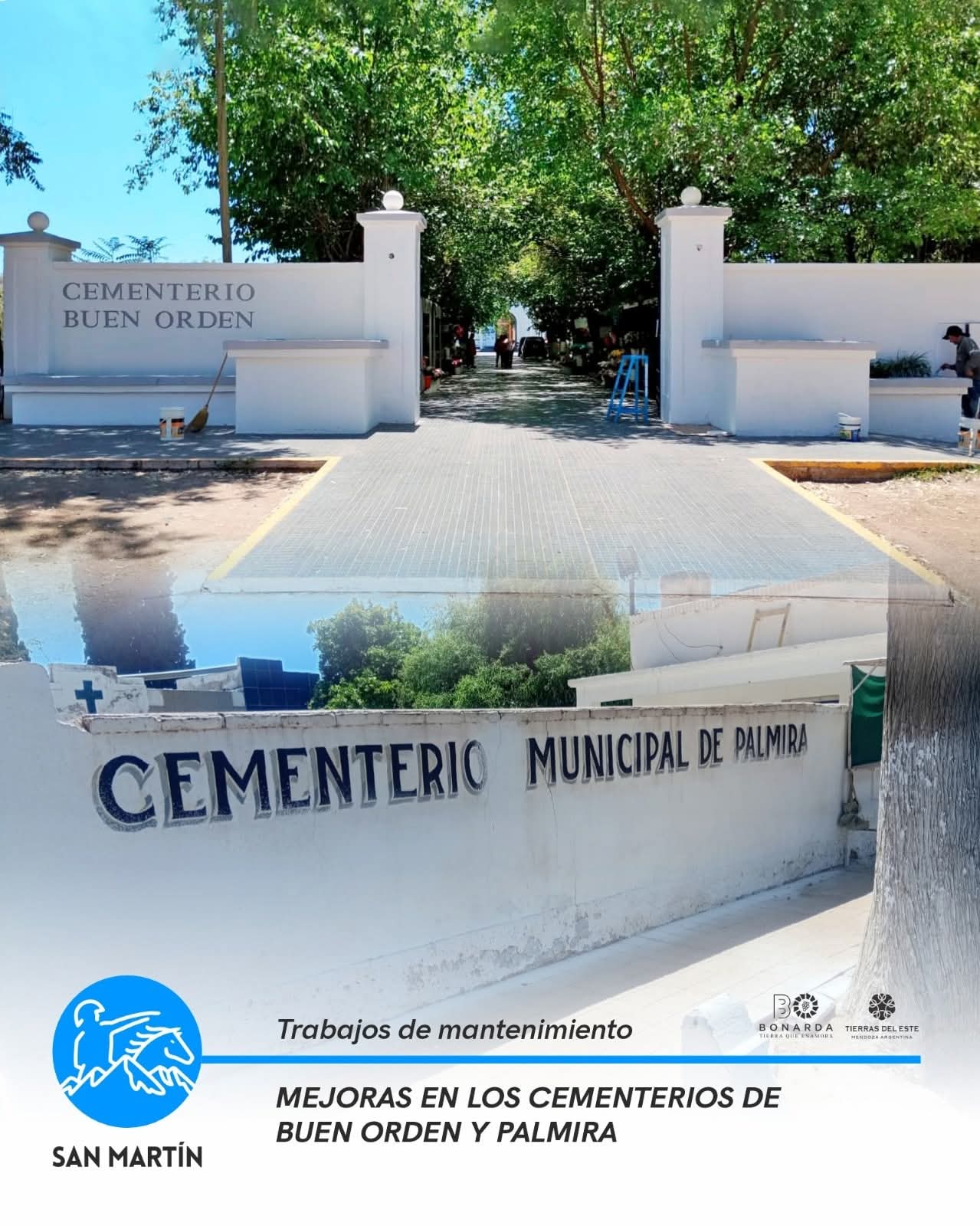 La Municipalidad de San Martín continúa con trabajos de mantenimiento y puesta en valor en los cementerios de Buen Orden y Palmira. Las tareas incluyen limpieza, pintura, reparación de calles internas y reacondicionamiento de fachadas, con el objetivo de mantener estos espacios en condiciones adecuadas para las visitas