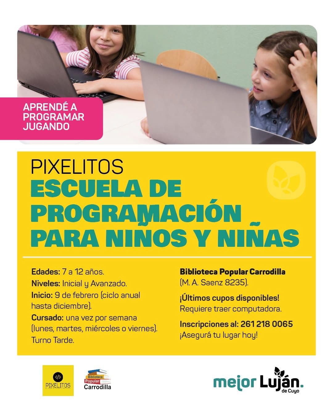 La Municipalidad de Luján de Cuyo informa a la comunidad que se encuentran disponibles los últimos cupos para el taller Programar Jugando, una propuesta educativa destinada a niños y niñas de entre 7 y 13 años, que promueve el aprendizaje de la programación de manera lúdica y creativa.