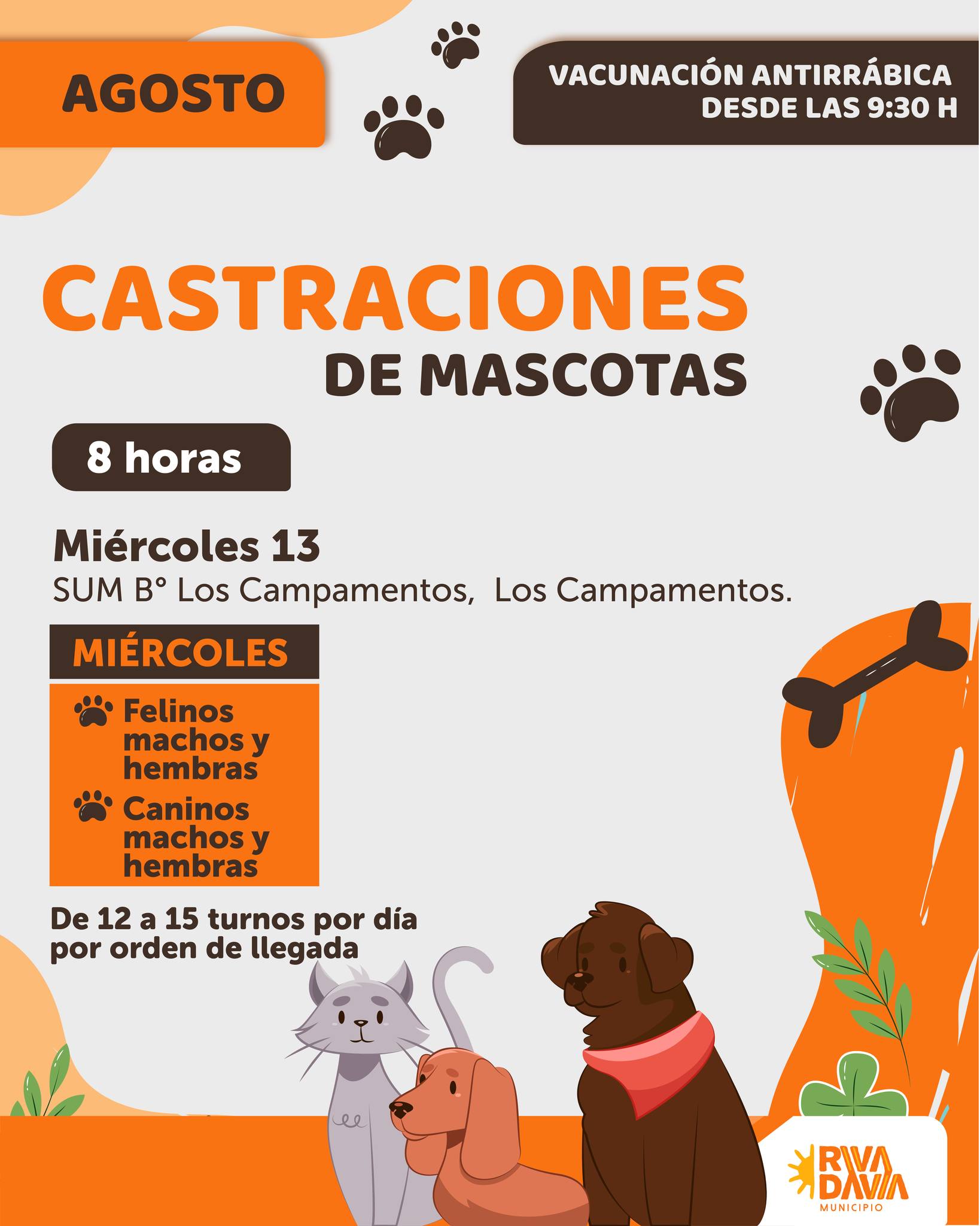 La Municipalidad de Rivadavia informó que el próximo miércoles 13 de agosto el quirófano móvil se instalará en el barrio Los Campamentos para llevar adelante una nueva jornada de castraciones y vacunación.