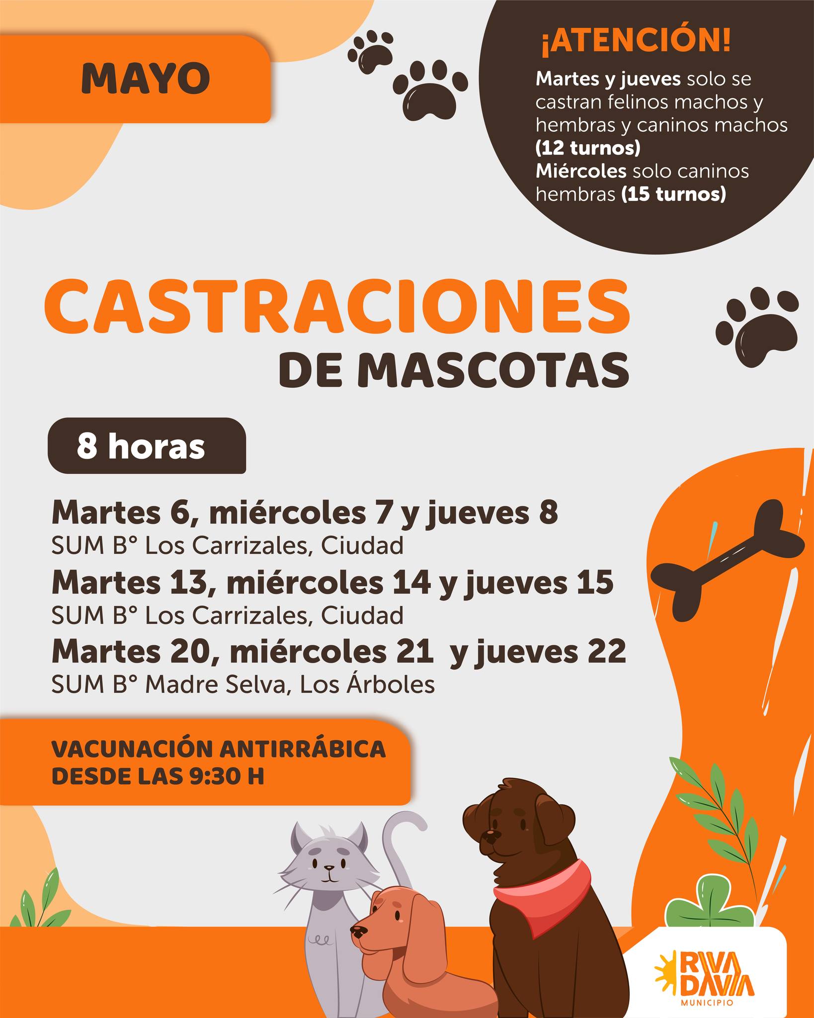 La Municipalidad de Rivadavia dio a conocer el cronograma del quirófano móvil para el mes de mayo, reforzando su compromiso con la salud animal y el control poblacional de mascotas.