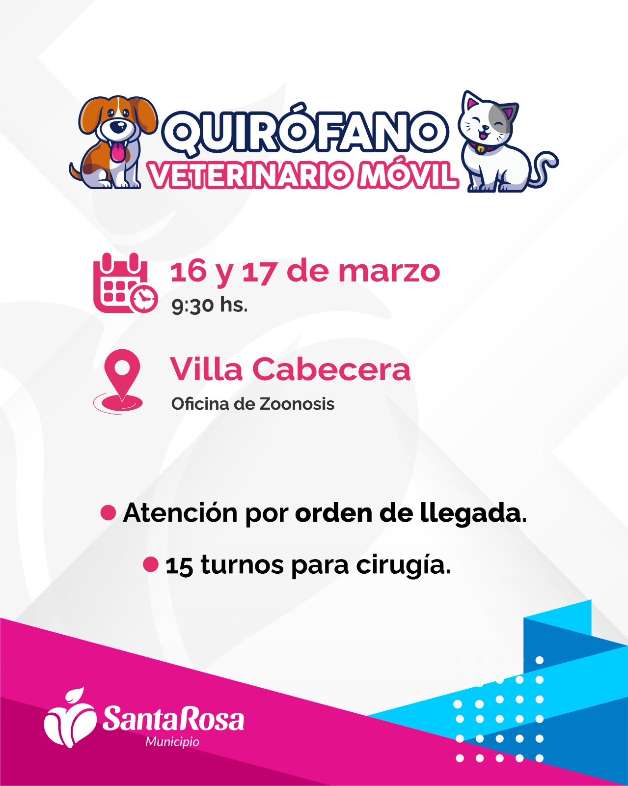 La Municipalidad de Santa Rosa informó que el Quirófano Veterinario Móvil prestará servicios los próximos lunes 16 y martes 17 de marzo en la Oficina de Zoonosis, ubicada en Villa Cabecera.