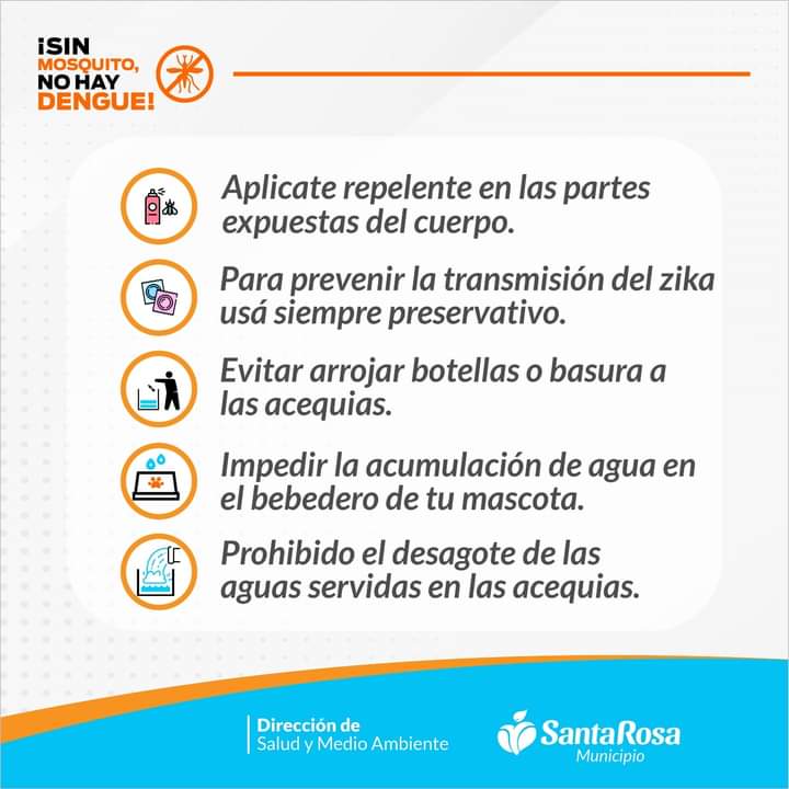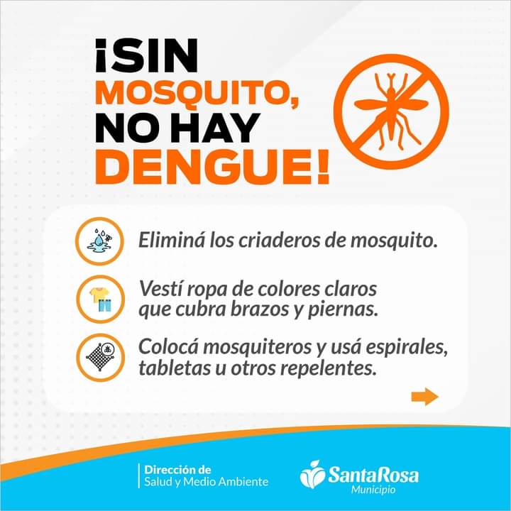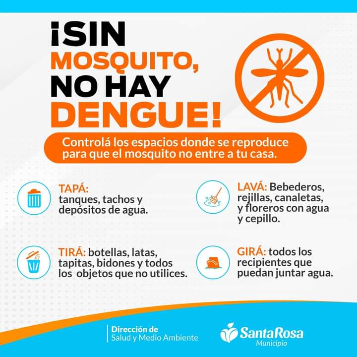 Desde la Dirección de Salud de Santa Rosa Municipio, lanzamos la campaña: «Sin mosquito, no hay dengue». Es importante que tengas en cuenta las siguientes recomendaciones: