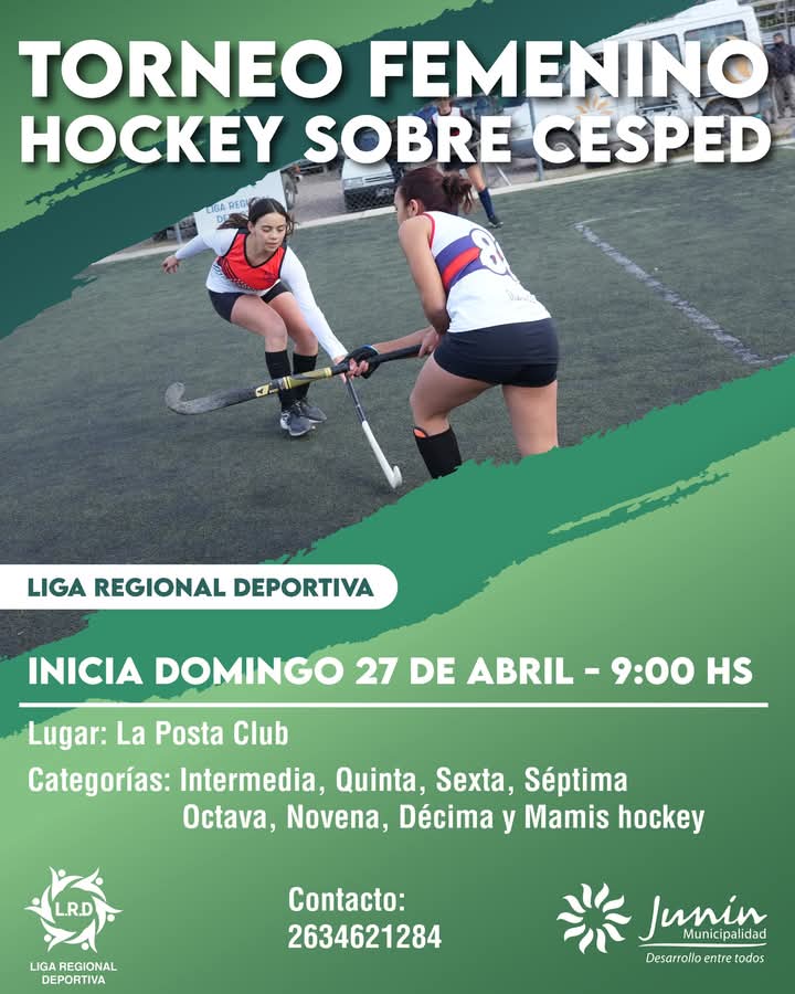 En las canchas de La Posta Club (calle La Posta s/n, Ciudad de Junín), organizado por la Municipalidad de Junín y en el marco de la Liga Regional Deportiva, desde el próximo domingo 27 de abril, a las 9.00, comenzará disputarse una nueva edición del Torneo Femenino de Hockey sobre Césped, con la participación de escuelas deportivas del departamento y departamentos invitados.